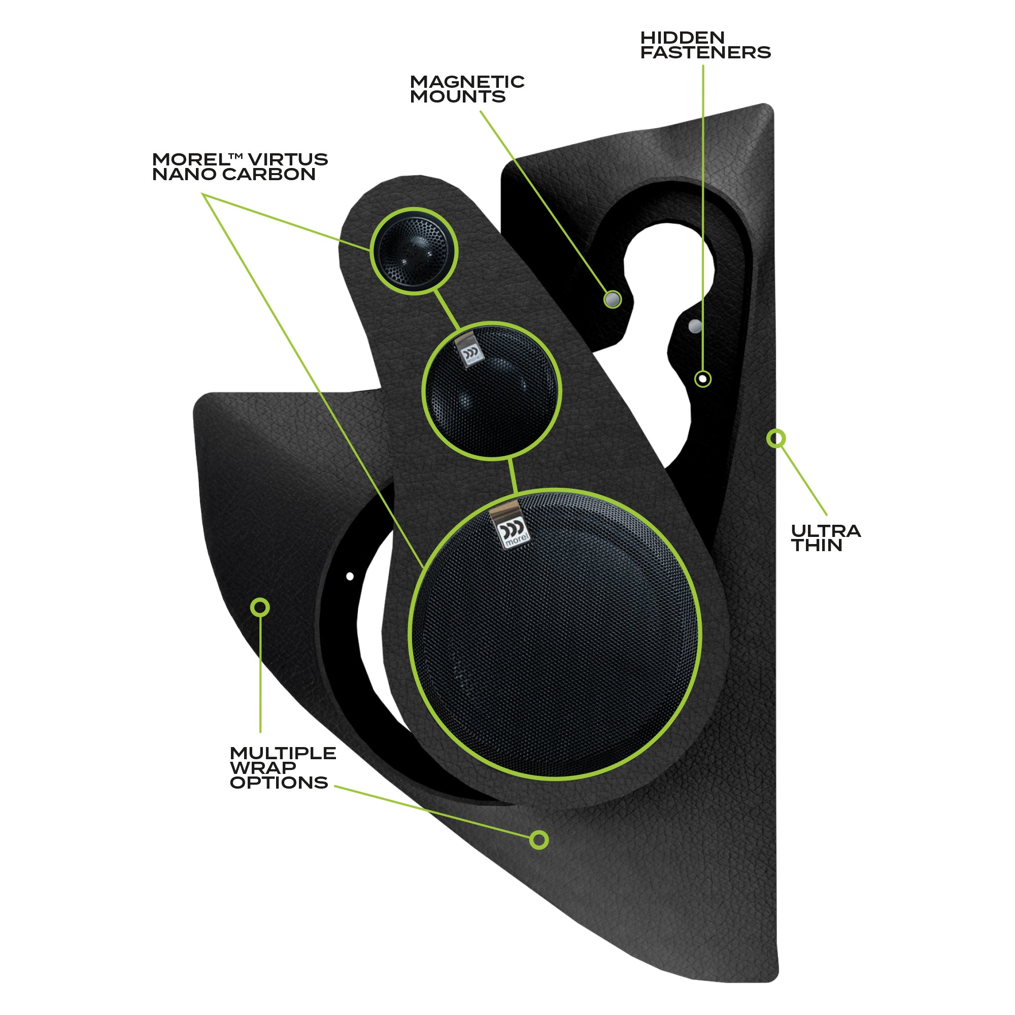 Transform your listening experience with our kick panels, designed to perfectly complement Morel™ Virtus Nano Carbon speakers. Choose the 2-way system with a 1.1” tweeter and 6.5” carbon fiber woofer for clear, balanced audio, or upgrade to the 3-way system, featuring Morel’s MM2 3-inch mid-range driver for enhanced vocal and instrumental depth. The added mid-range driver brings the heart of your music to life, creating a dynamic and immersive soundstage. Built with precision and crafted for performance, these kick panels and speakers deliver a seamless blend of style, functionality, and premium sound quality. Experience audio like never before.