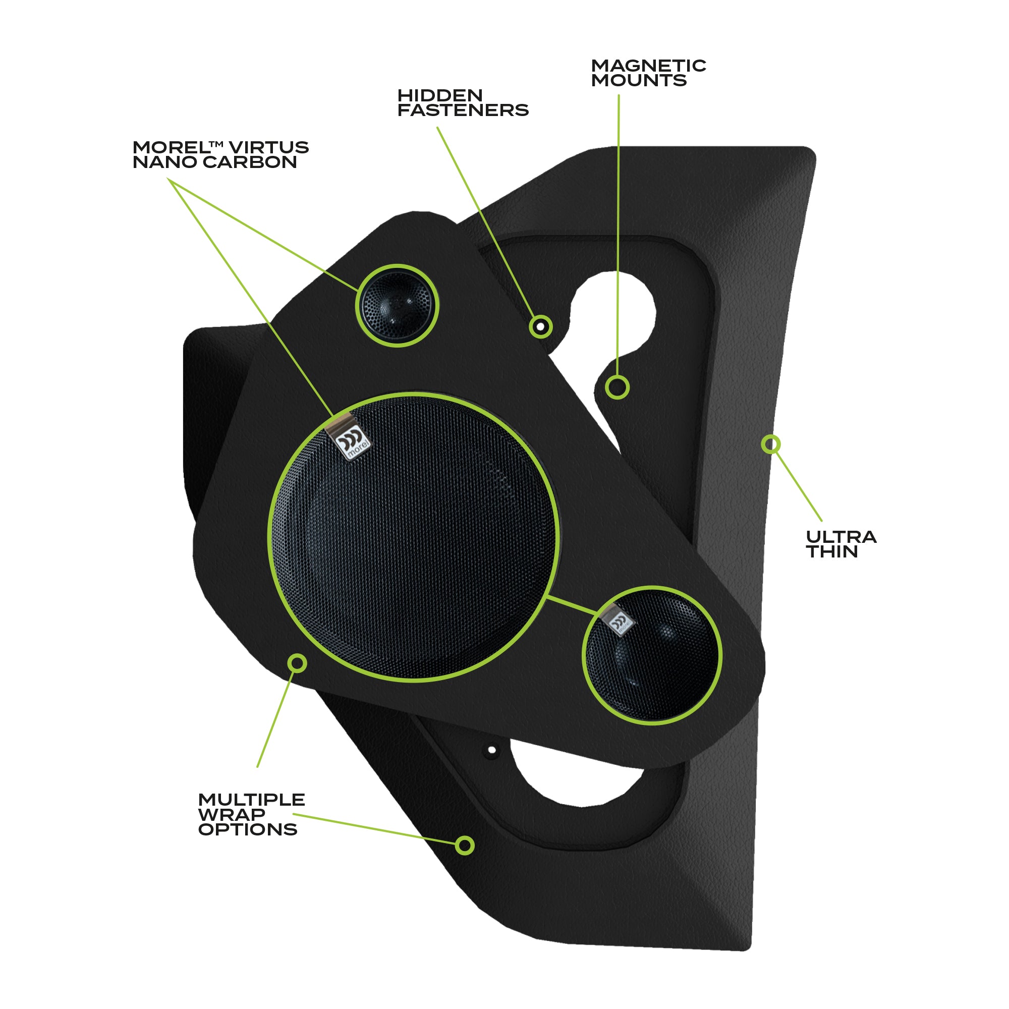 Enhance your listening experience with our kick panels, expertly paired with Morel™ Virtus Nano Carbon speakers. Choose the 2-way system featuring a 1.1” tweeter and 6.5” carbon fiber woofer for exceptional clarity, or go further with the 3-way setup, which includes Morel’s MM2 3-inch mid-range driver. The added mid-range speaker brings instruments and vocals to life, enriching the center of the frequency range for a concert-like sound. Designed with precision and crafted for excellence, these kick panels and Morel speakers work in perfect harmony to deliver an unmatched blend of style, functionality, and premium audio quality. Immerse yourself in sound like never before.